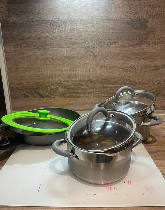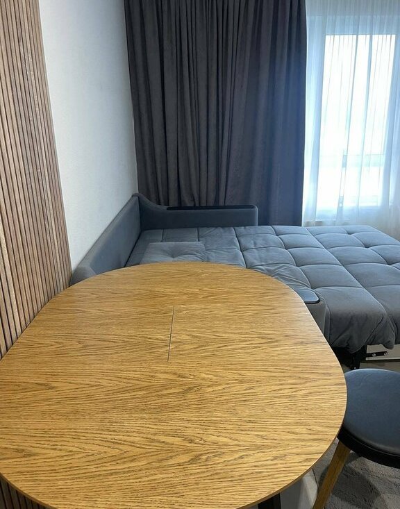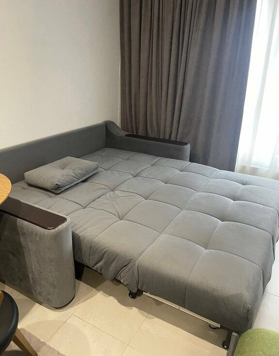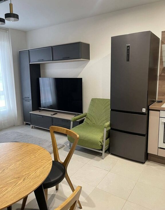 Гостиная-кухня. Диван-аккардеон фирмы Moon безшовный, ППУ. Кресло-кровать. Смарт ТВ 65 дюймов Toshiba. Безшумный холодильник Haier. СВЧ Samsung. Плита индукция. Духовка. Качественная посуда. Фильтр воды 3 ступени.