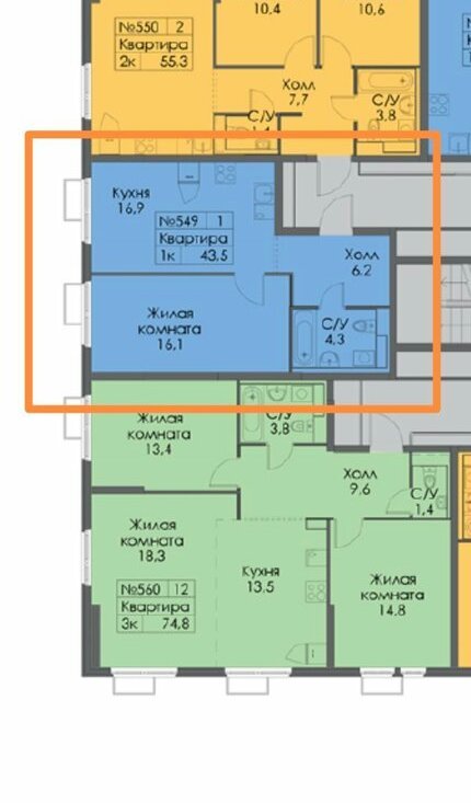 Гостинная-кухня 17м2, спальня 16, прихожая 6, с/у 4.