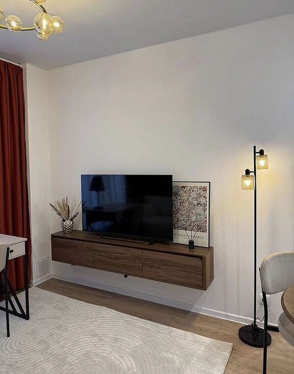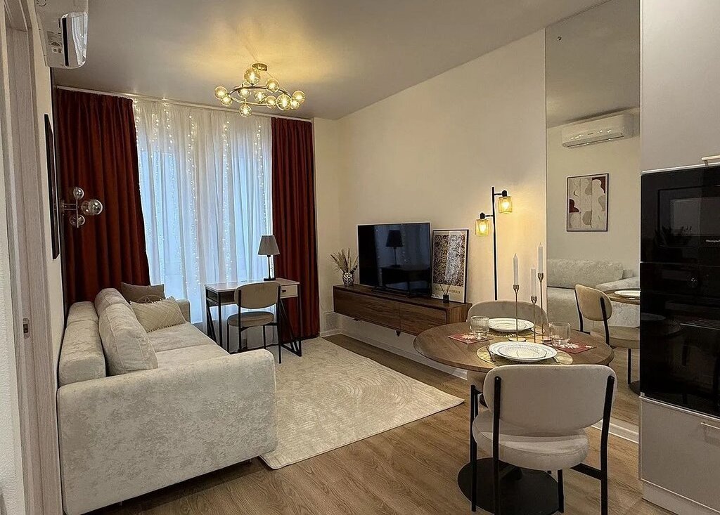 - уютная гостиная с раскладывающимся диваном, телевизором и рабочим местом.