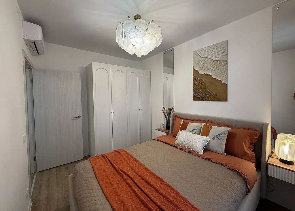 - спальня с двуспальной кроватью с подъемным механизмом и удобным матрасом, два функциональных шкафа.
