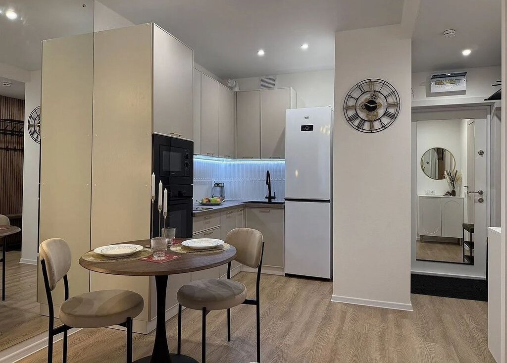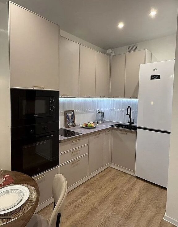 - вместительная кухня со встроенной техникой (СВЧ, духовка, ПММ, варочная поверхность, вытяжка, фильтр питьевой воды) и холодильником. Имеется необходимый набор посуды и столовых приборов.