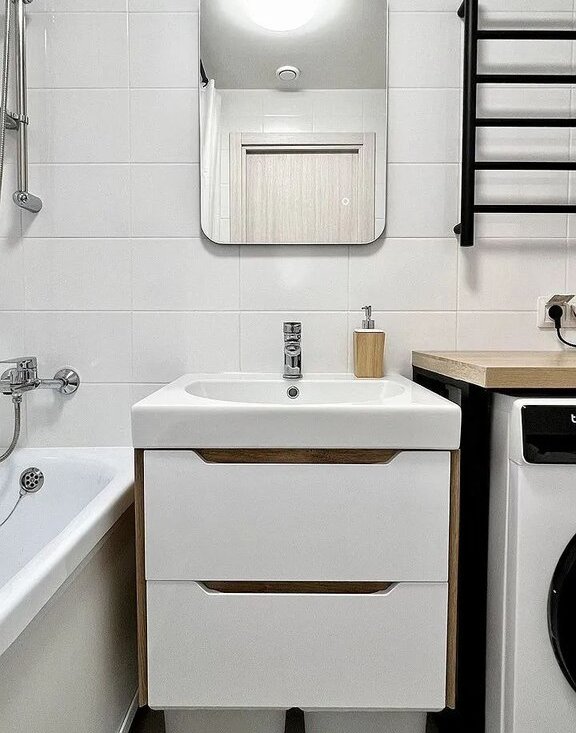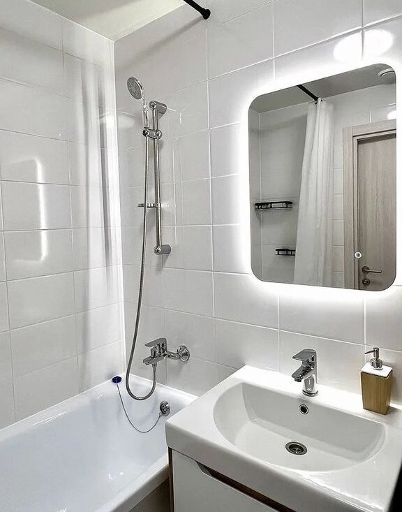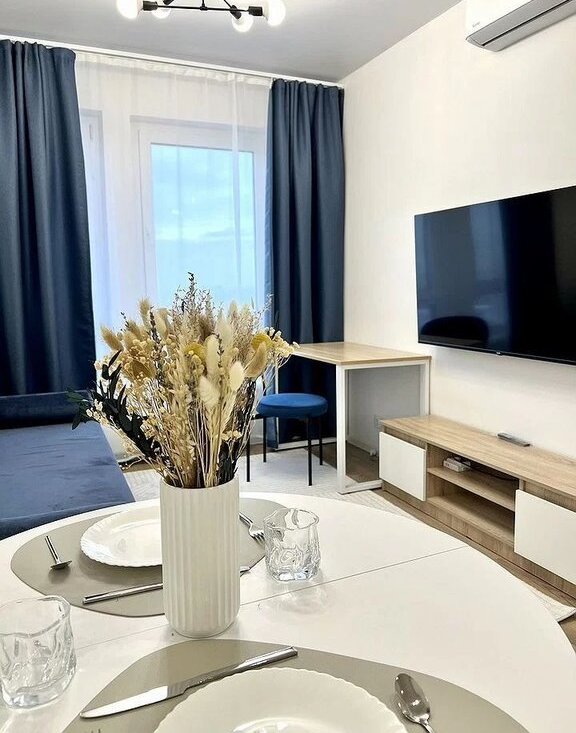 Из техники установлены: кондиционер, стиральная машина, посудомоечная машина, холодильник, духовка, индукционная варочная панель, вытяжка, микроволновка, телевизор. Для удобства также есть фильтр для питьевой воды (обратный осмос), пылесос, набор посуды.