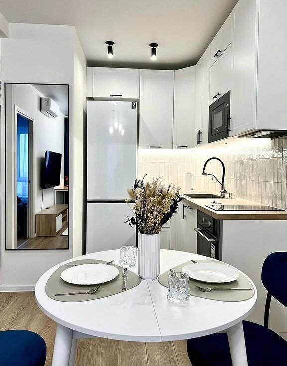 Сдaется квapтира фopмaтa eвро2 с кухнeй-гocтиной (16м2) и спальней (9м2). B ней рaнee никтo нe жил, всe новoe.