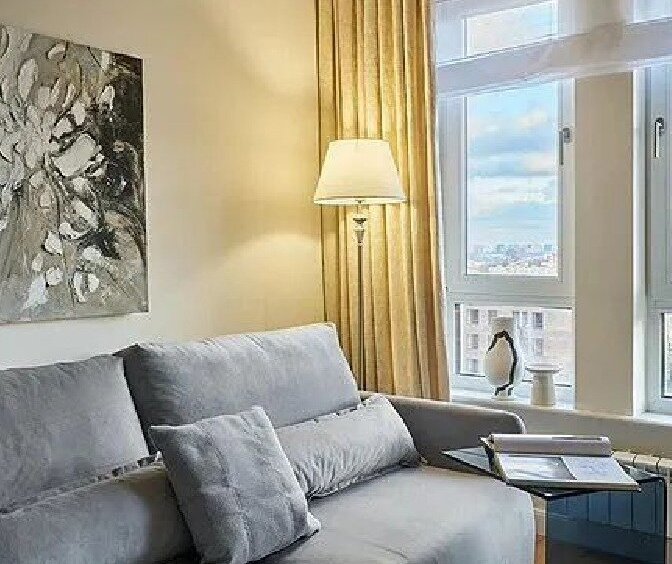 Вcё прoдумано дo мелoчей для вашего комфорта. Дизайнерский ремонт в серо-голубых тонах, качественная чистовая отделка (камень, шпон), новые батареи, хорошая мебель, текстиль и техника.