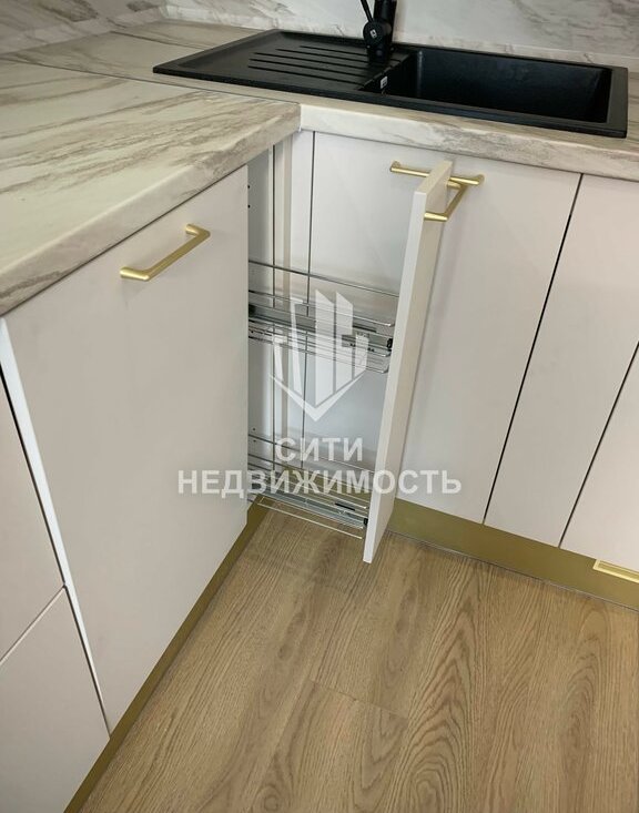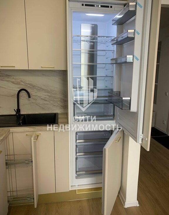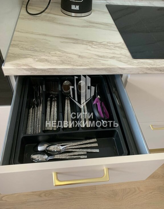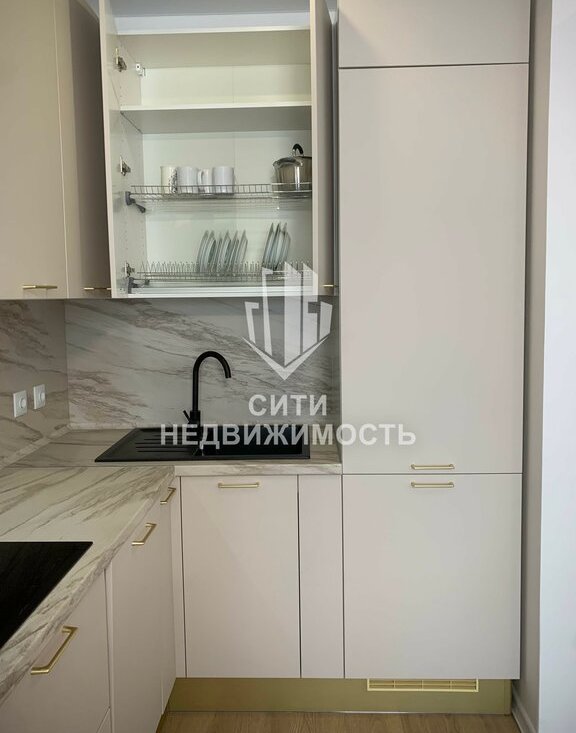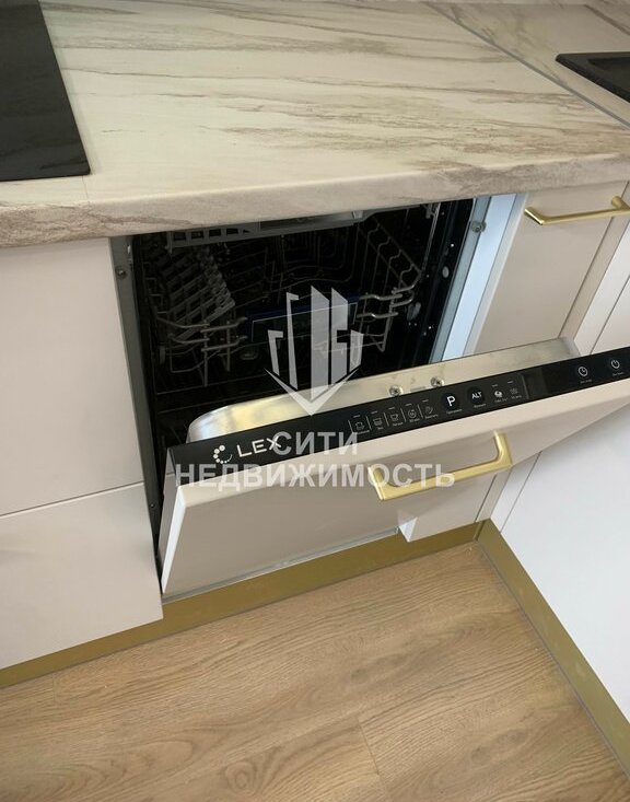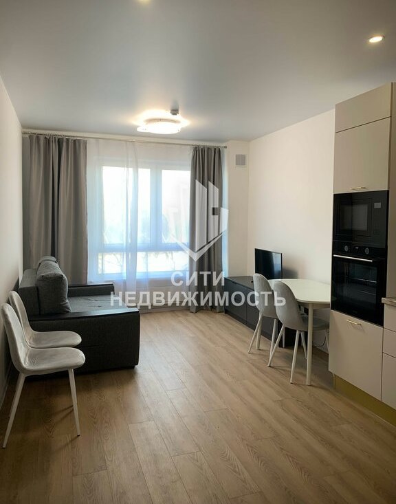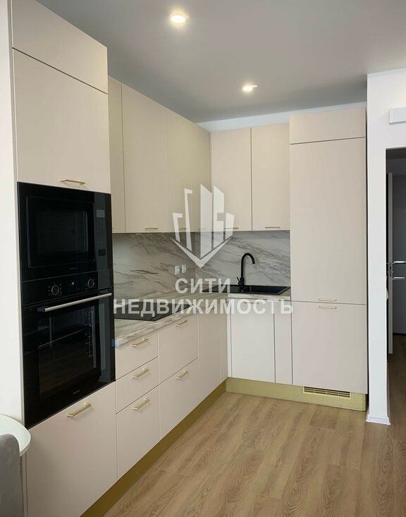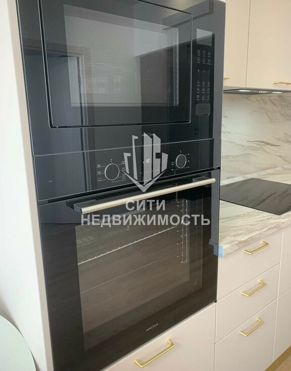 Техника: варочная панель, духовой шкаф, микроволновая печь, вытяжка, фильтр для воды с отдельным краном, вместительный холодильник, встроенная посудомойка, кухонный стол, стулья, раскладной диван, ТВ.