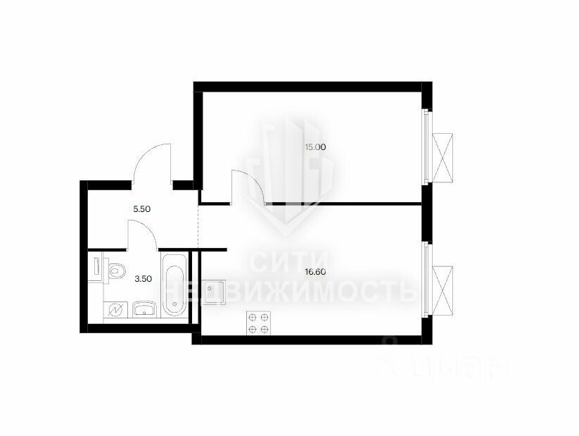 Просторная кухня-гостиная 16,6 м². Изолированная спальня 15 кв.м.. Большая прихожая 5,3 кв.м. Санузел совмещенный.