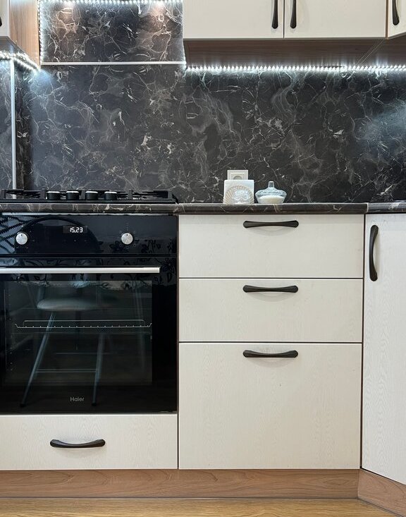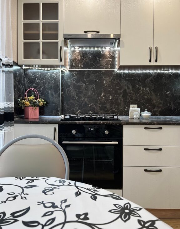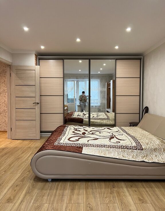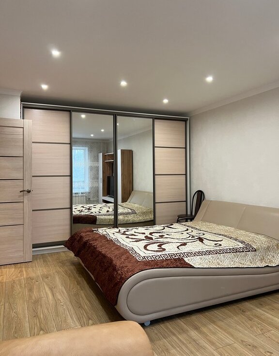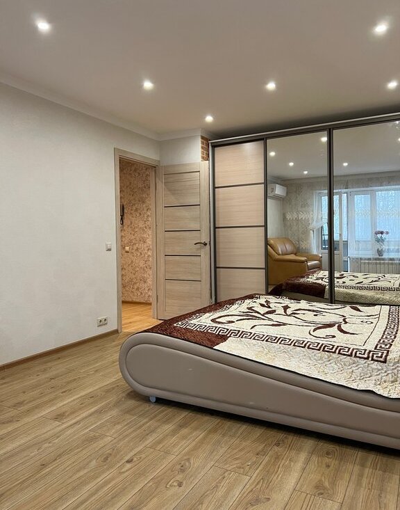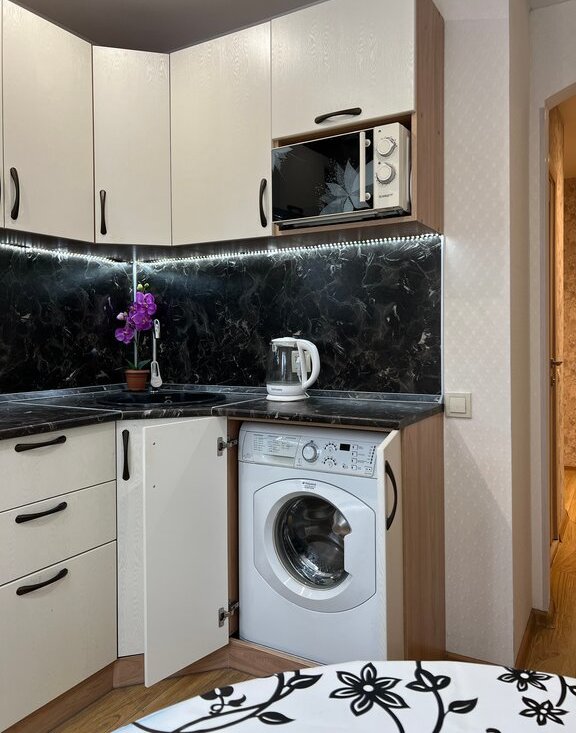 Укомплектованная кухня, со стиральной машиной. Двуспальная кровать 2х1.6 м., кожаный диван. Шкаф-купе во всю стену. Лоджию в теплое время года можно использовать как рабочий кабинет.
