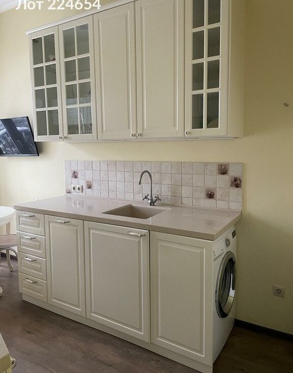 Есть вся необходимая мебель и техника: плита, духовой шкаф, вытяжка, посудомоечная машина, холодильник, телевизор, стиральная машина.