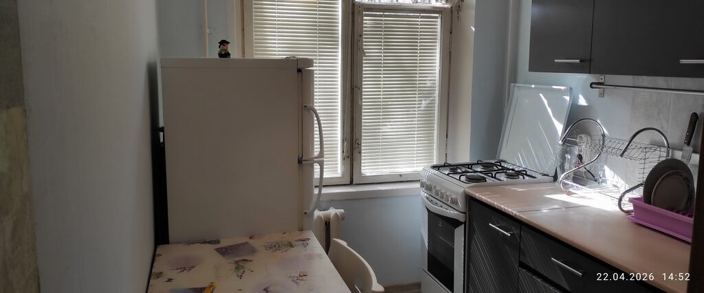 Рынок 3 минуты, до метро 10 минут спокойным шагом. Рядом с домом поликлиника. Кухня новая. Большой коридор и комната. Квартира распашонка, окна на обе стороны дома.