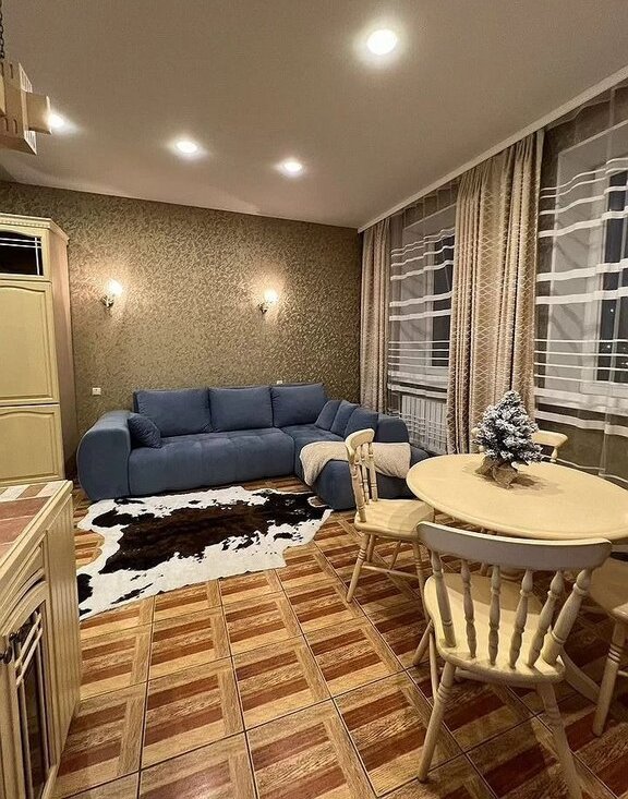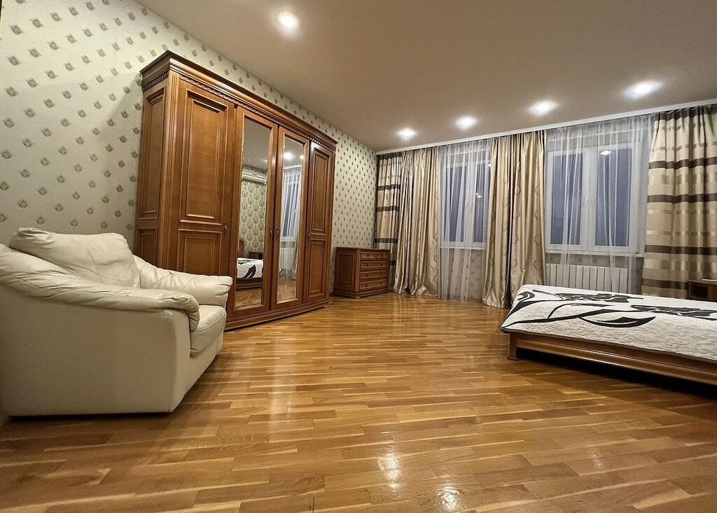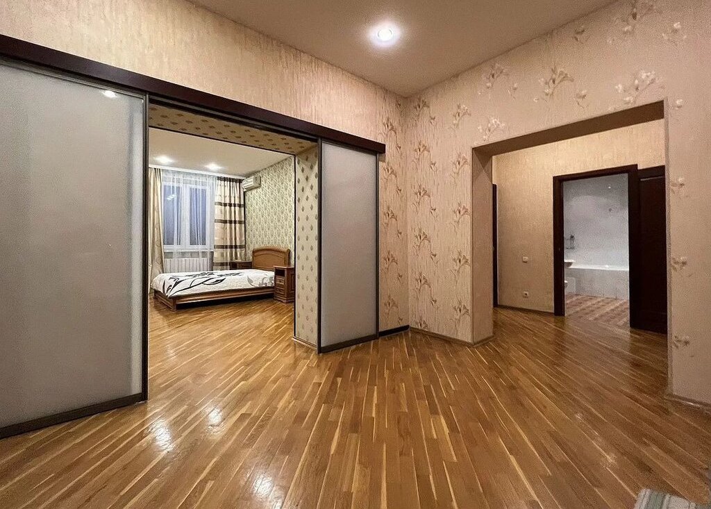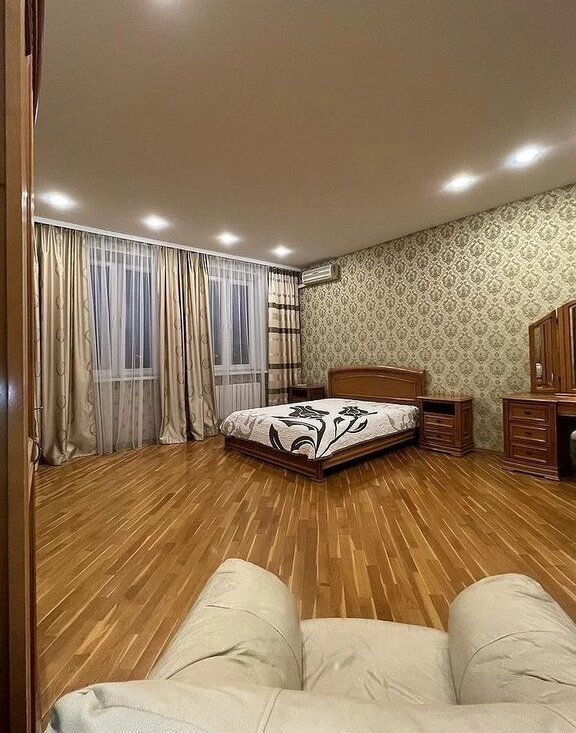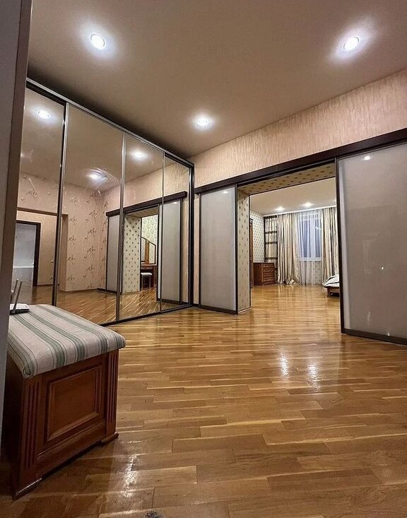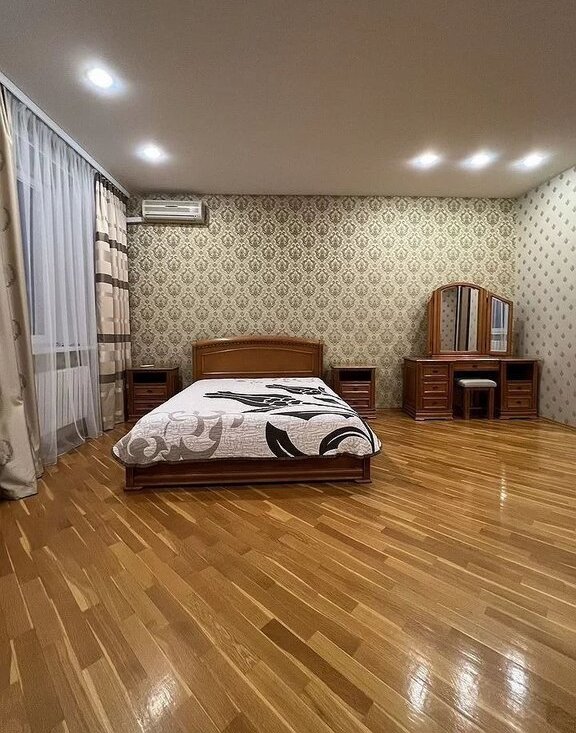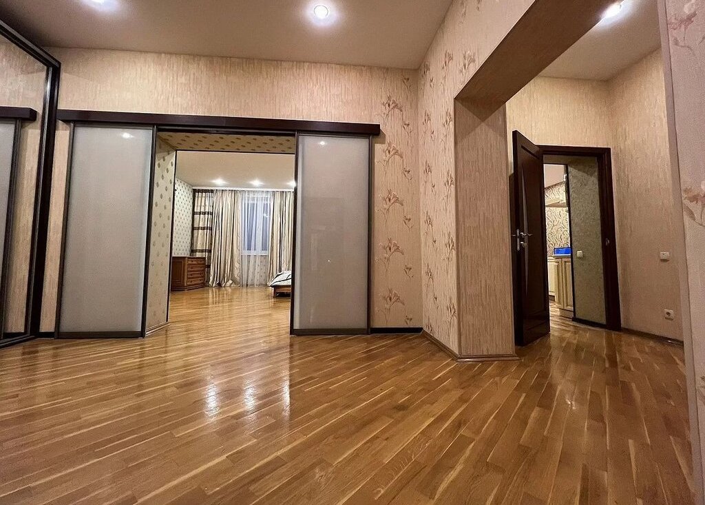 Кухня-гостиная 26 м, спальня 27 м, два холла 18м. Ванная комната 10 м, душевая кабина и ванна, высота потолка- h3 м, тканевые. Пол: паркетный.