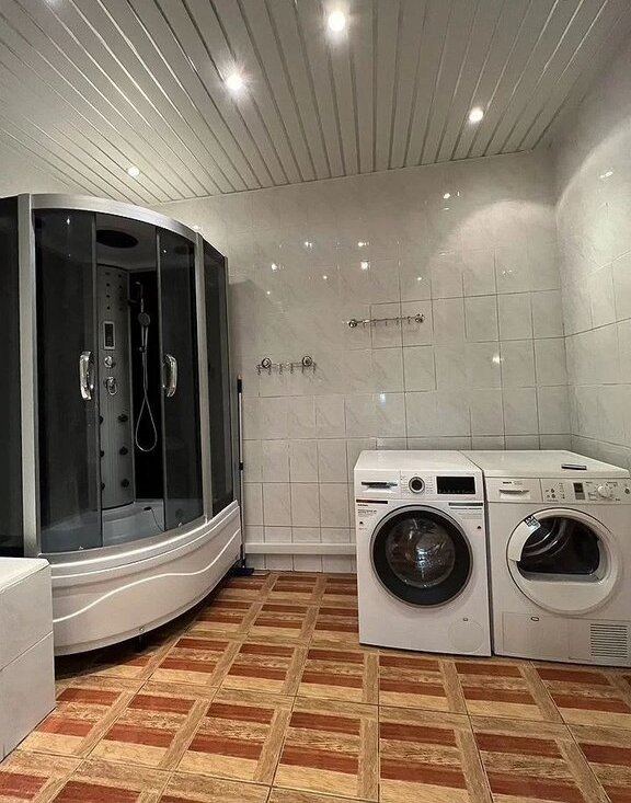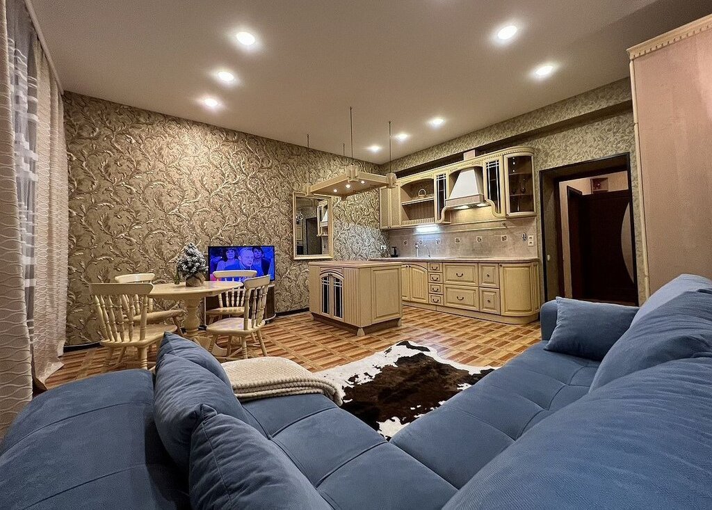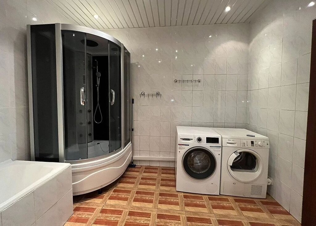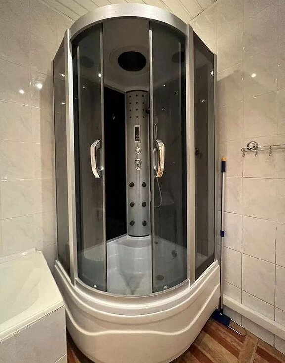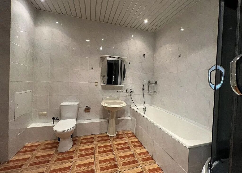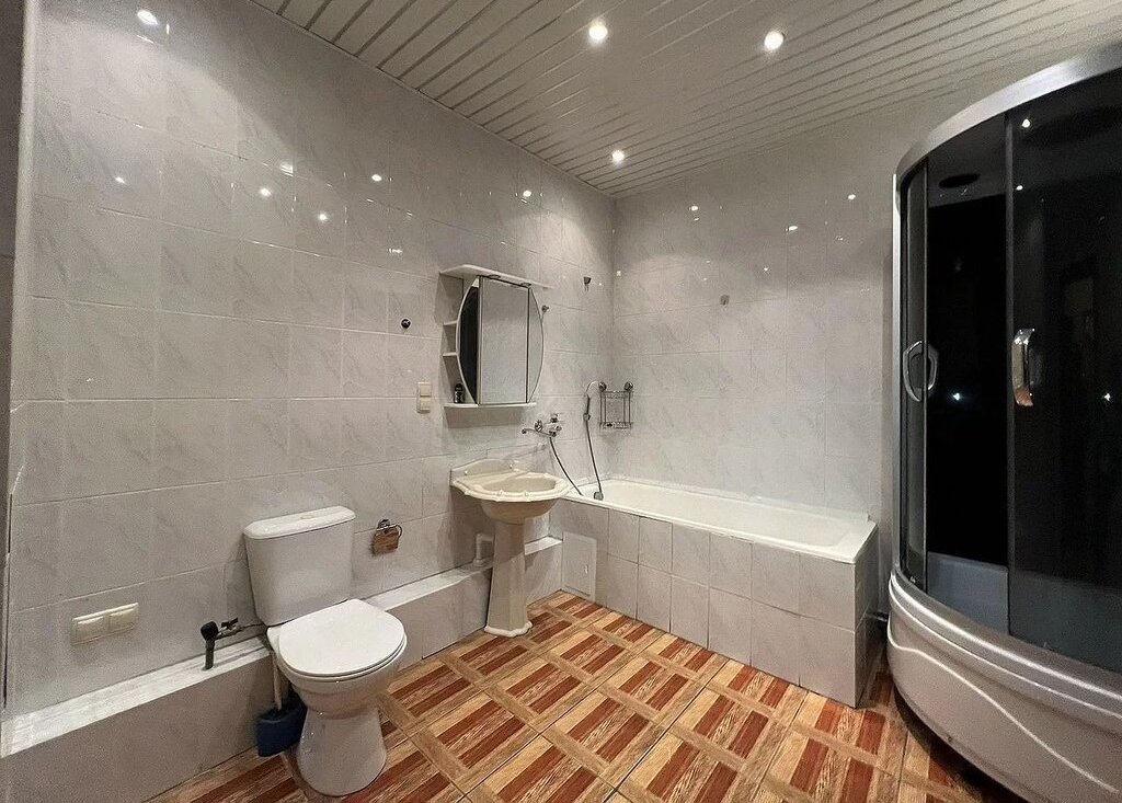 Кухня-гостиная 26 м, спальня 27 м, два холла 18м. Ванная комната 10 м, душевая кабина и ванна, высота потолка- h3 м, тканевые. Пол: паркетный.