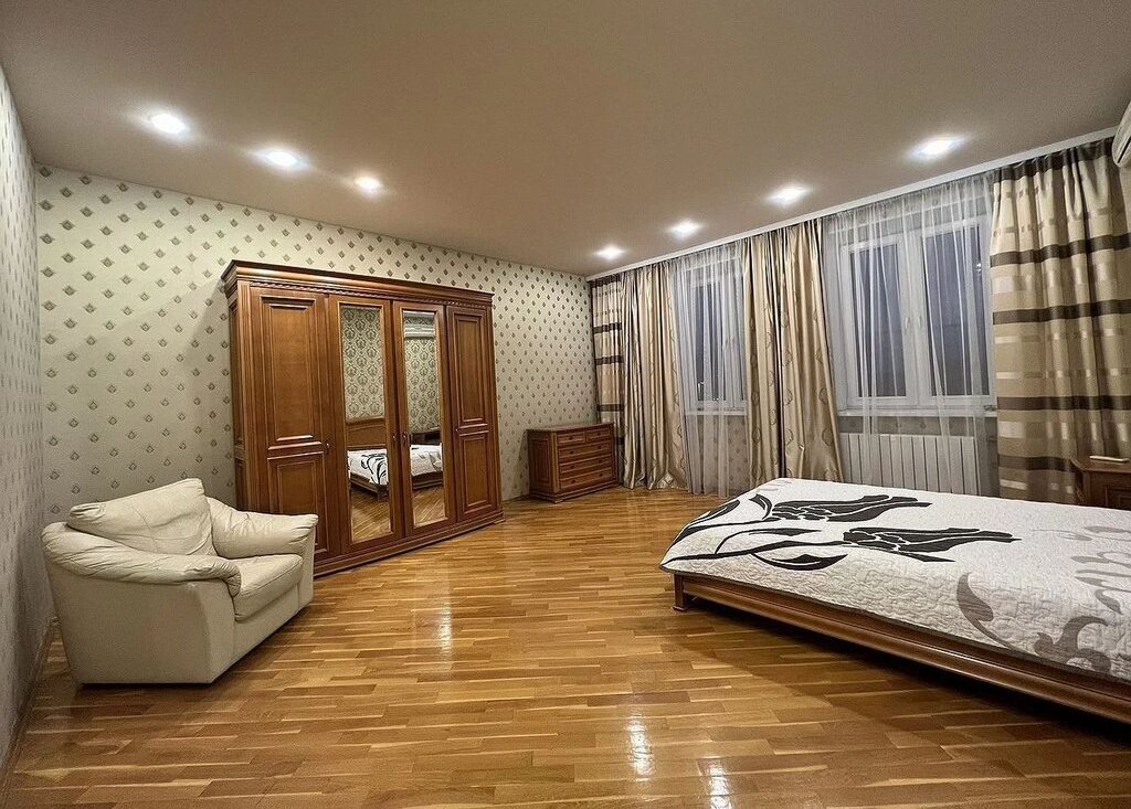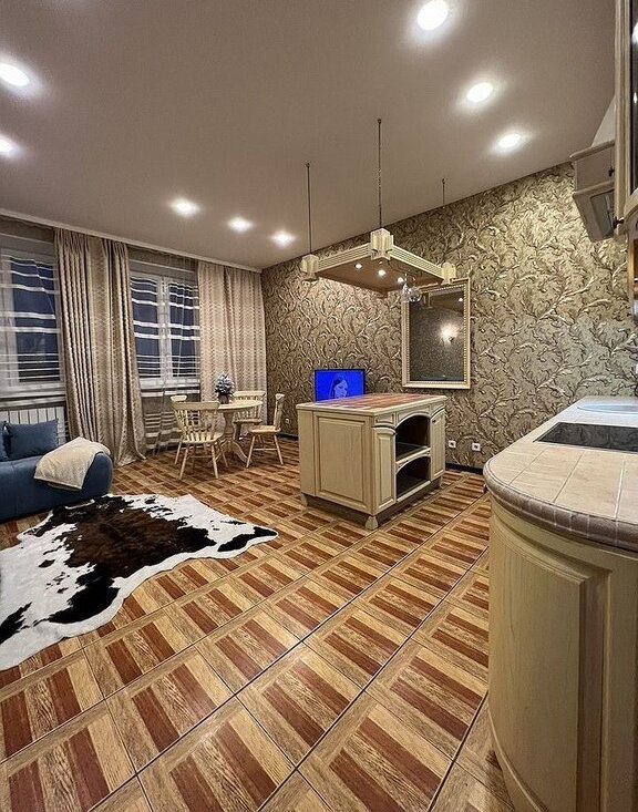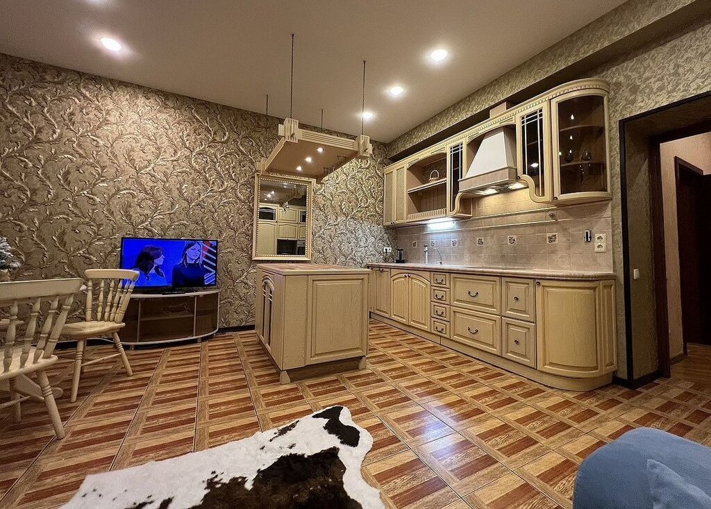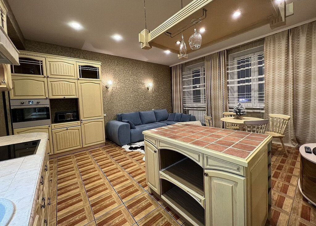 Сплит-система. Аква-фильтр. Сушильно-стиральный комплекс Бош. Квартира оснащена техникой высокого класса. Стиральная машина автомат с пятно-выведением, само-размораживающийся холодильник, бесшумный с зоной биофреш. Духовой шкаф с конвекцией, посудомоечная машина автомат, панель С защитой от детей, микроволновая печь, электрочайник.. Кухня - Франция, дуб с теснением, Бар-остров. Новый, раскладывающийся полностью диван в
