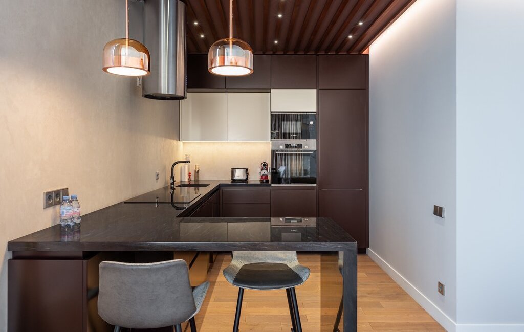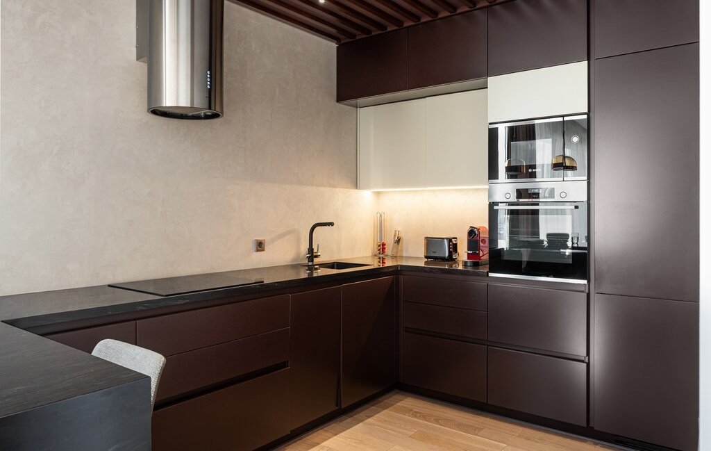 Кухня выполнена в современном минимализме и полностью укомплектована: варочная панель, духовой шкаф, кофемашина, чайник, посудомоечная машина, вся необходимая посуда.