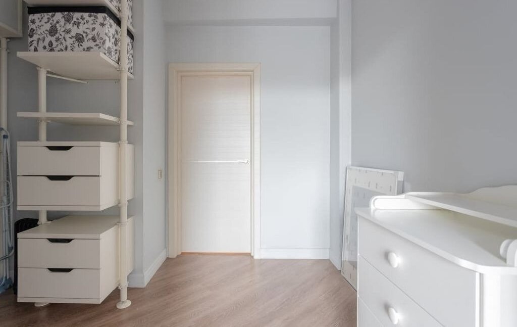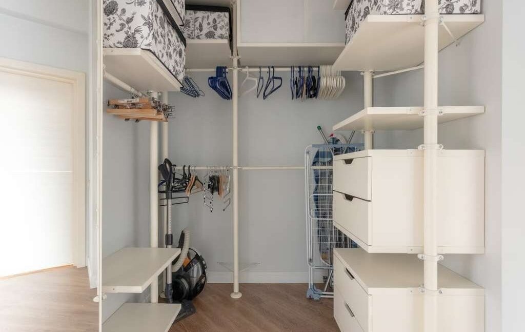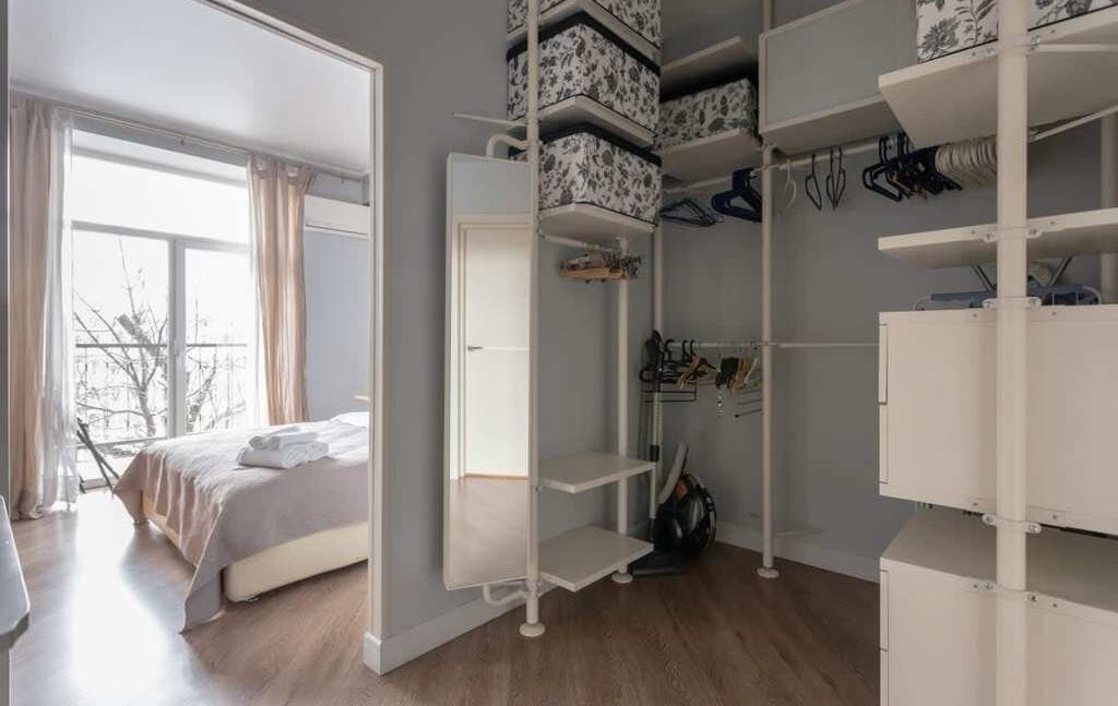Рядом расположена вместительная гардеробная с полками и вешалками, а также гладильной доской и утюгом.