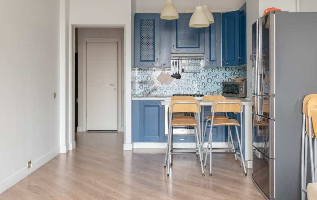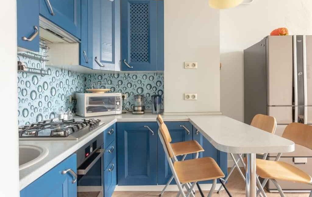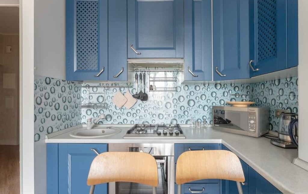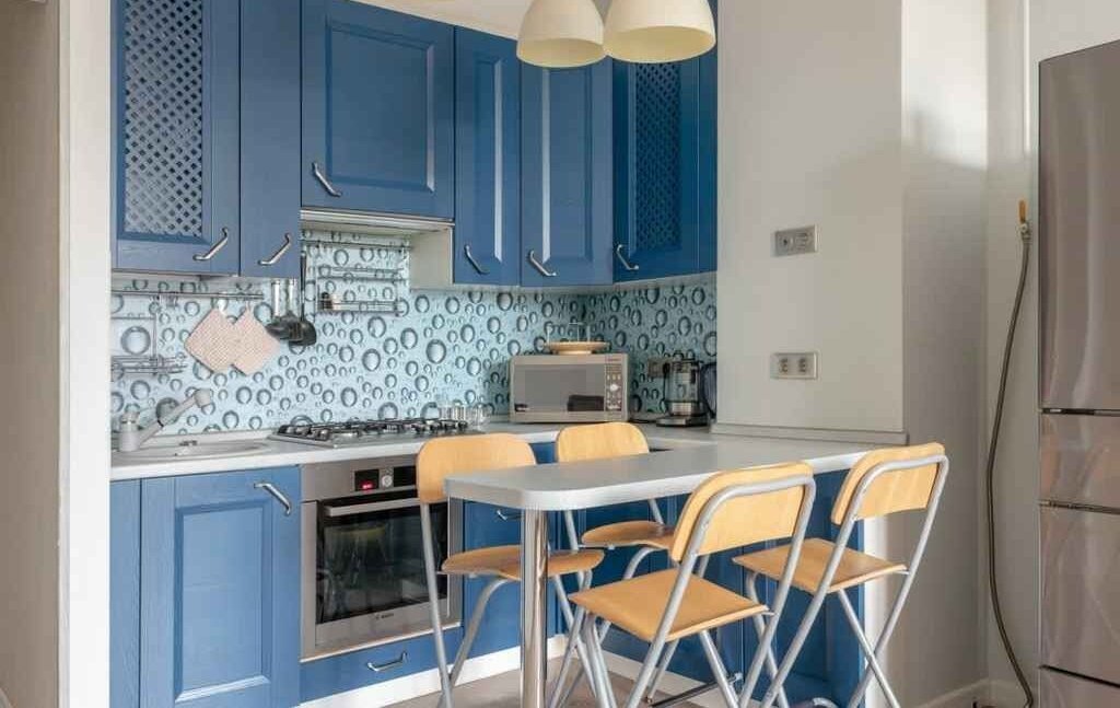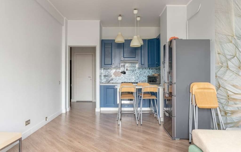 Кухня-гостиная выполнена в современных синих оттенках и объединяет зону отдыха и приготовления пищи. В распоряжении арендаторов:
