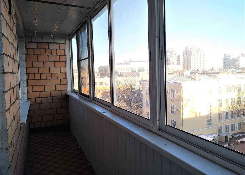 Огромная застекленная лоджия. Общая площадь с лоджией 38 кв.м. Окна - пластиковые стеклопакеты. На полу паркет.