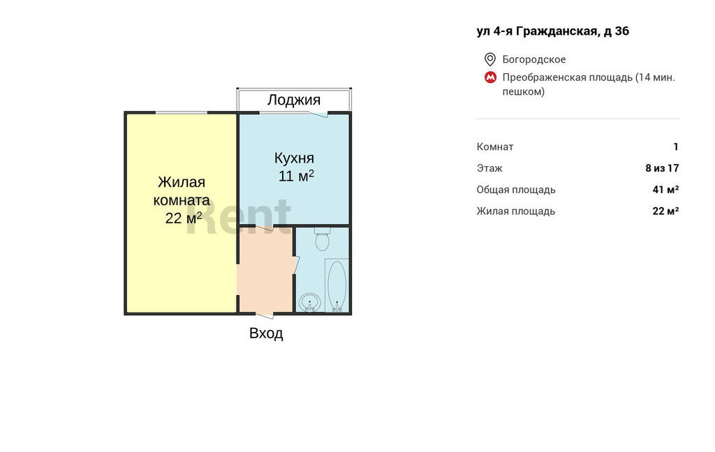 1-комнатная квартира: Москва, 4-я Гражданская улица, 36 (41 м²)