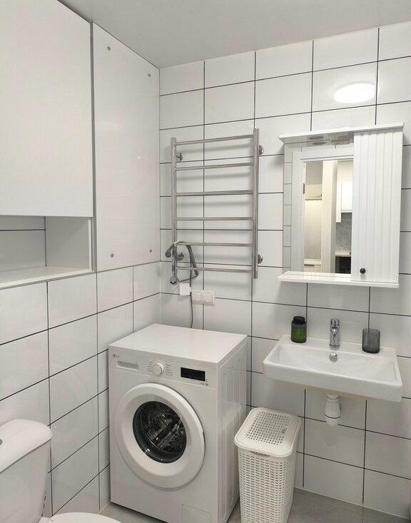 Установлена новая техника: варочная панель, духовой шкаф, холодильник, микроволновая плита, чайник, набор кухонных приборов и посуды, стиральная машина, утюг (+ гладильная доска, сушилка для белья), телевизор, пылесос, электрический полотенцесушитель, кондиционер. Подключен интернет. Санузел совмещённый. Балкона нет. Посудомоечной машины нет.