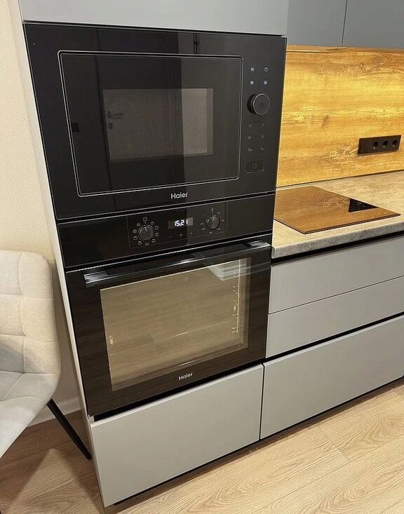 Встроенная варочная панель, духовой шкаф, посудомоечная машина, встроенная микроволновка. Холодильник с морозилкой.
