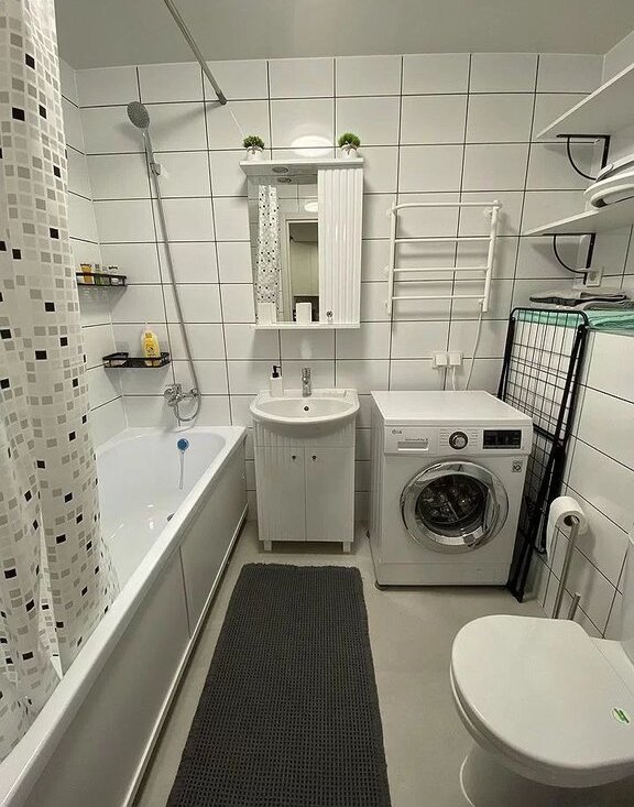 - стиральная машина, гладильная доска, утюг, сушилка, электрический полотенцесушитель, текстиль ( набор махровых полотенец), банные аксессуары, пылесос .