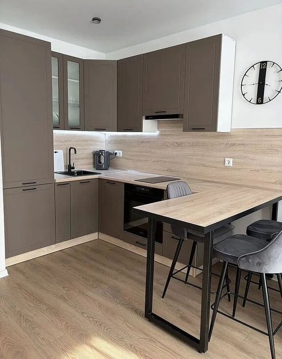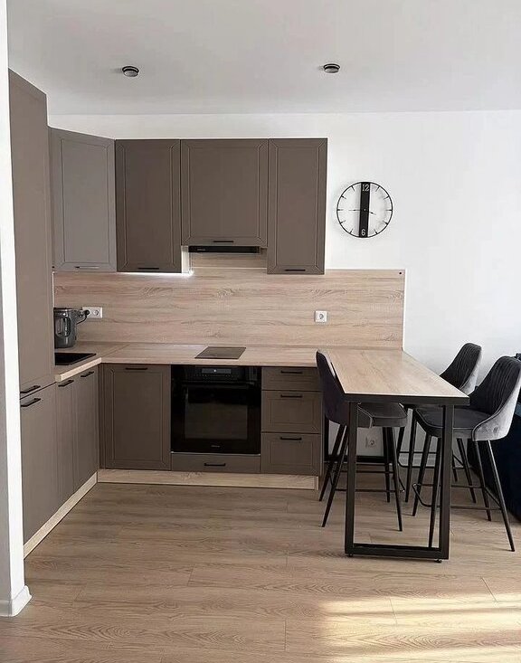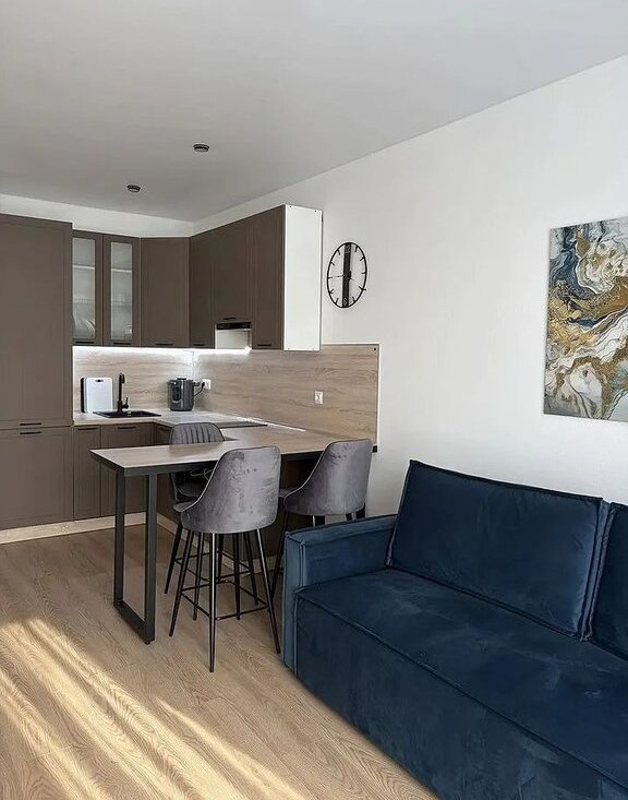 Кухня просторная, площадью 15 м², оснащена современной техникой: холодильником, плитой и микроволновой печью. Комнаты оснащены кондиционерами. Из мебели — стильный обеденный стол и барные стулья. В гостиной установлен удобный диван и телевизор, в спальне второй телевизор и вместительный шкаф для хранения вещей.