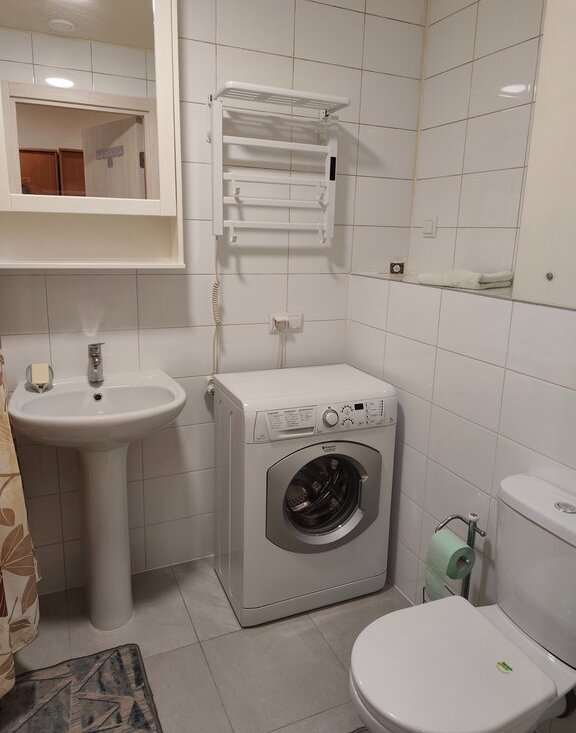 Квартира оборудована всей необходимой для комфортного проживания мебелью и современной техникой: встроенная кухня, варочная панель, духовка, холодильник, стиральная машина-автомат, кондиционер, два больших шкафа, шкаф-обувница, большая кровать, раскладной диван.