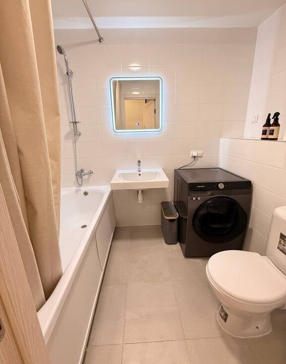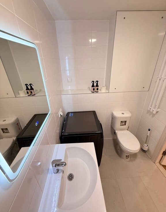 Стиральная машина с функцией сушки. Качественная сан техника. Встроенный зеркальный шкаф в прихожей.