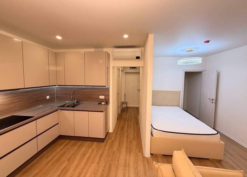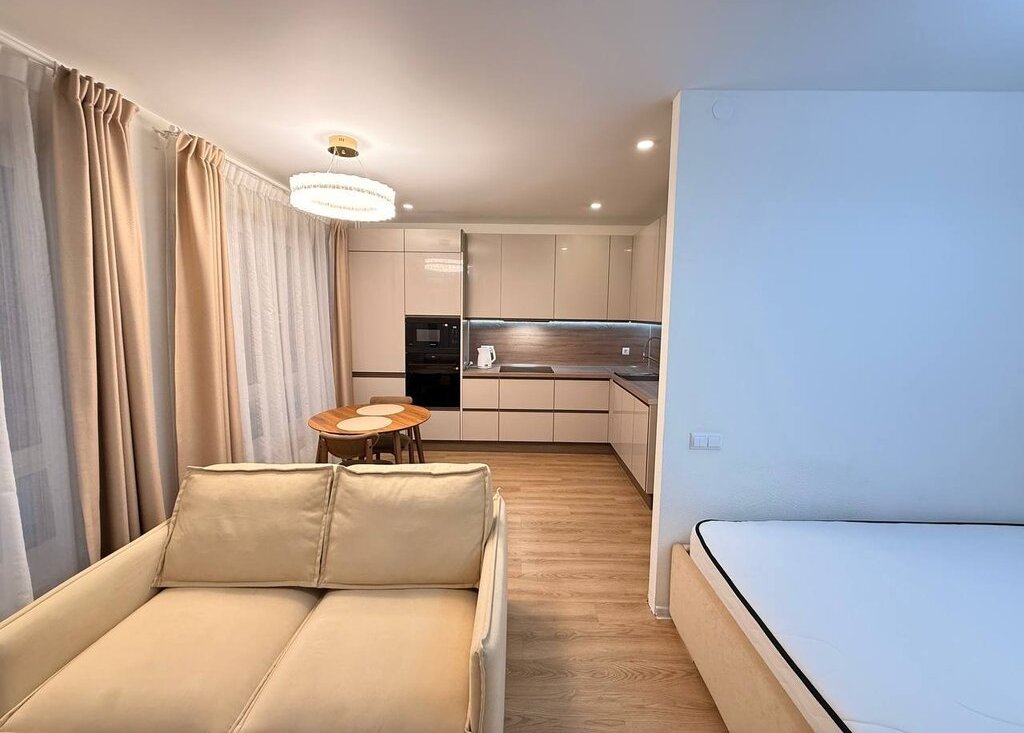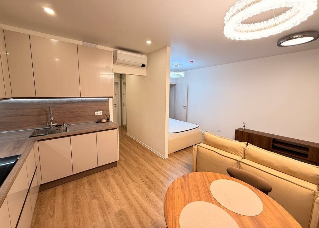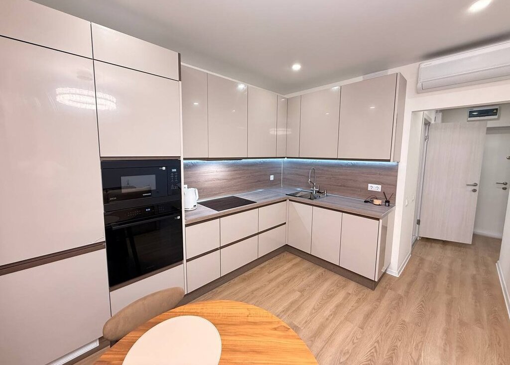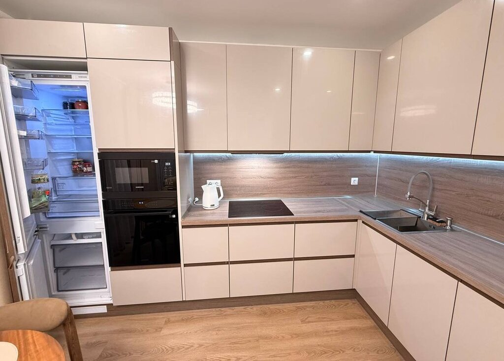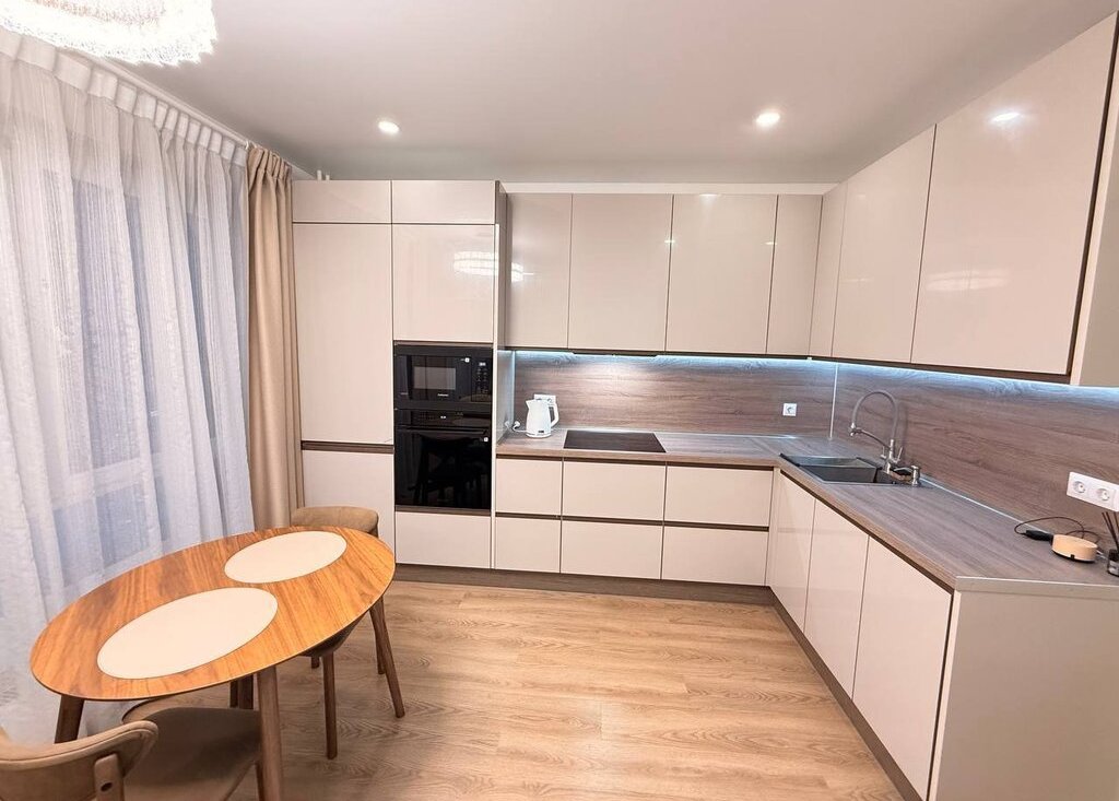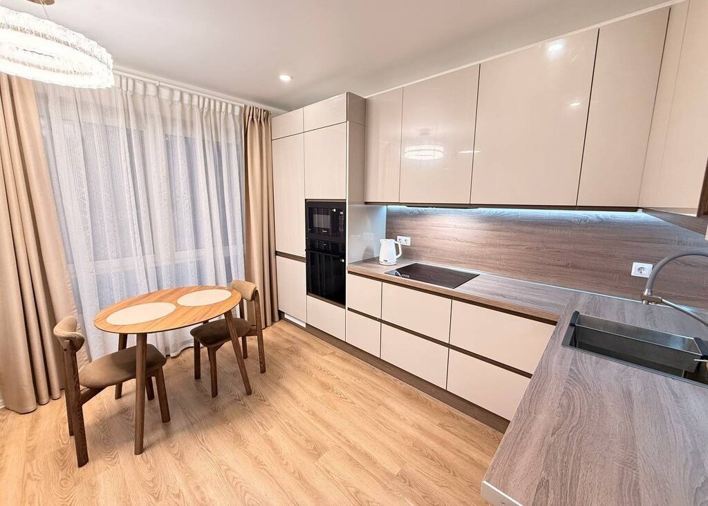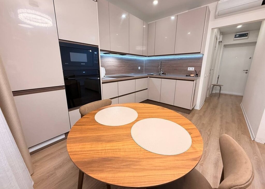 Установлен кухонный гарнитур, варочная панель, духовой шкаф. Встроенный холодильник. Встроенная микроволновка. Обеденный стол. Кондиционер. Вся техника SAMSUNG с возможностью управления через приложение.