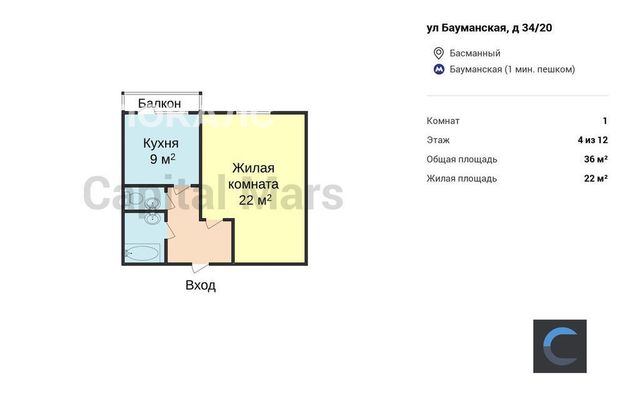 1-комнатная квартира: Москва, Бауманская улица, 34/20 (36 м²)