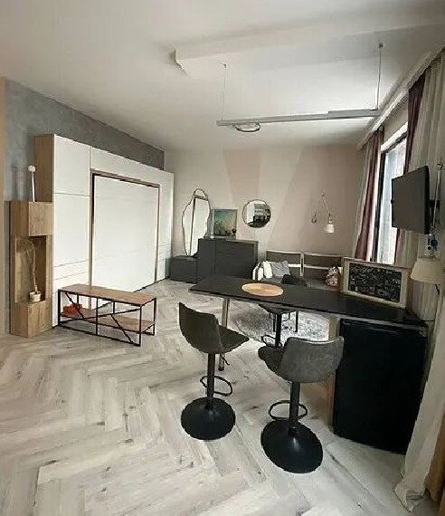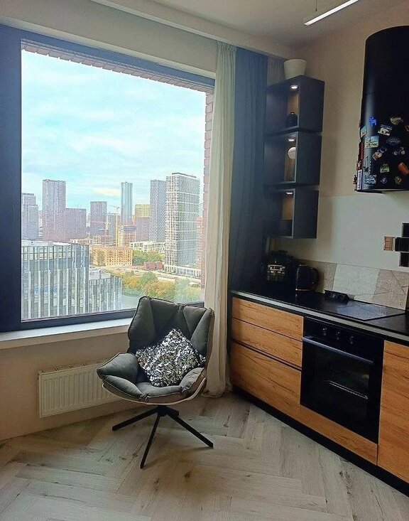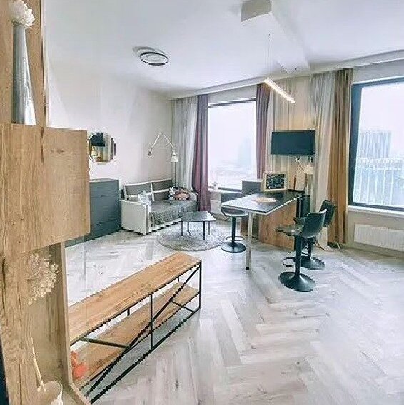 Квартира с новым, качественным ремонтом,высокие потолки и огромные панорамные окна делают квартиру очень просторной .Гостиная и кухня-столовая в одном пространстве. Кухонная зона оборудована современной техникой (посудомоечная машина, холодильник, микроволновая печь, вытяжка, духовой шкаф, плита). В квартире установлен шкаф-трансформер со встроенной кроватью,что поможет реорганизовать пространство и наполнить комнату новым функционалом,имеется так же раскладной диван-кровать Сан.узел с душевой кабиной и стиральной машиной.