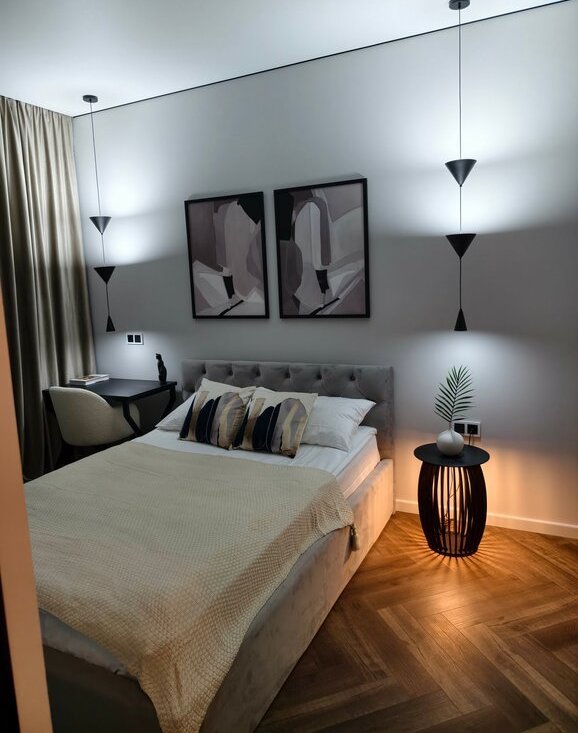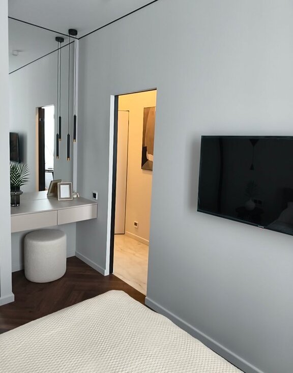 Сделан теплый пол в зоне коридора, санузла и кухни-гостиной. Грамотно продумана система кондиционирования. Современный кондиционер оснащен WiFi модулем, что позволяет запускать его дистанционно. Великолепное световое решение интерьера выполнено стильно, лаконично, грамотно.
