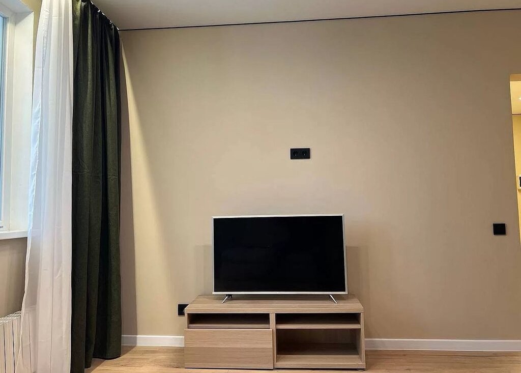 В гостиной просторный диван, который разбирается и становится полноценное 2-х спальное большое место. Установлен смарт телевизор.