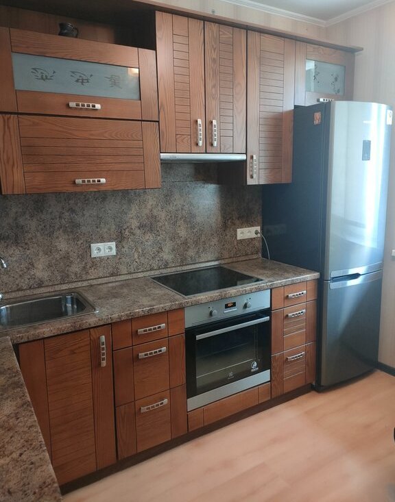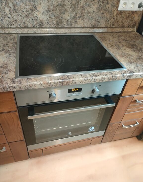 Бытовая техника - стиральная машина, холодильник, варочная панель, духовой шкаф.