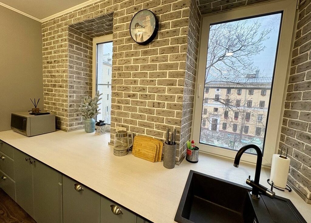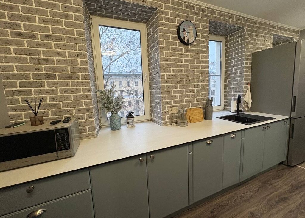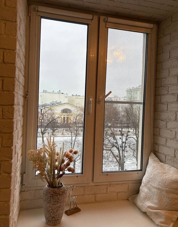 Из окон спальни открывается завораживающий вид на оживленный бульвар и театр «Современник». Окна кухни-гостиной выходят в тихий, благоустроенный двор.