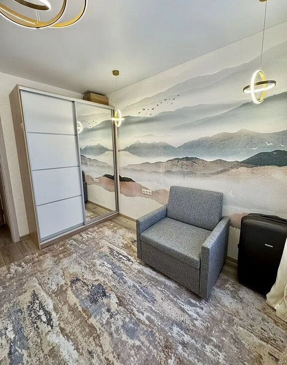 - Отдельная спальня ): большой двухсекционный шкаф, раскладное односпальное кресло, утюг, гладильная доска, можно поставить кровать, которая необходима арендатору;