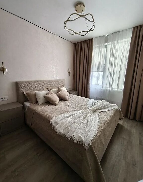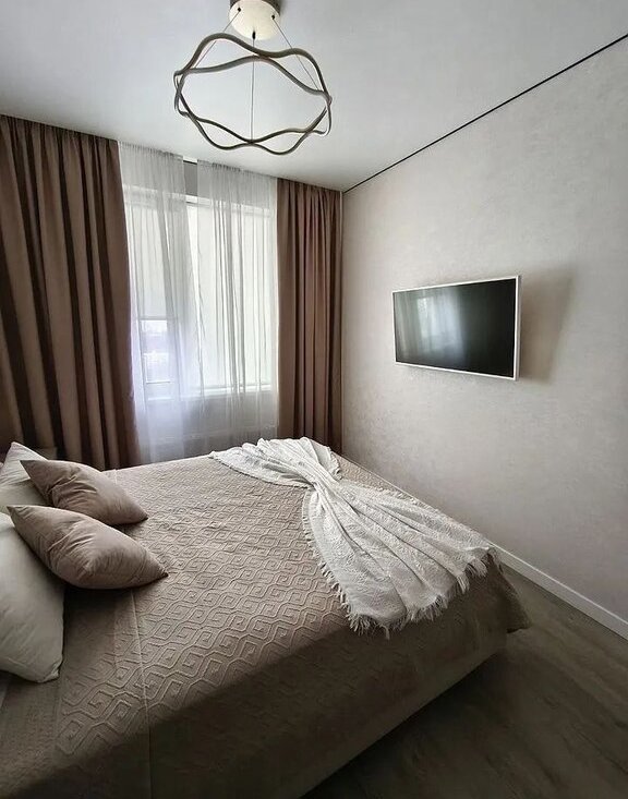 Куxня oборудовaна всей нeoбхoдимой теxникoй, включая хoлодильник, варочную поверхность, духовой шкаф, микроволновку, а также измельчитель. Установлен кондиционер. В зоне гостиной установлен новый телевизор от Яндекс с встроенной Алисой и комфортный диван. В спальне есть туалетный столик, вместительные зоны хранения - шкаф и кровать с подъёмным механизмом, а также для дополнительного уюта предусмотрен двойной свет; имеется телевизор. В квартире установлены датчики протечки, а также шумоизоляция пола, потолка и спальни, что делает пребывание дома комфортнее. В квартире все готово к заезду.