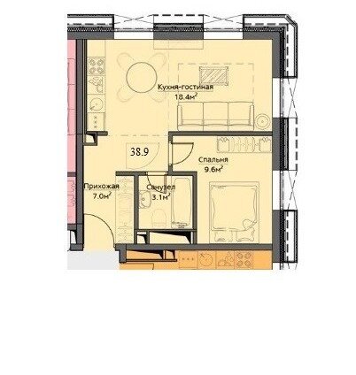 Общ.площадь 40м, кухня-гостиная 19м, комната 10м, прихожая 7.0м, ванная 3.1м. Потолки 2.85м. Есть вся мебель и техника для комфортного проживания.