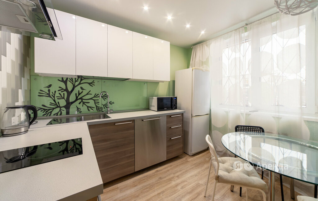 Мебель: кухонный гарнитур с подсветкой и встроенной техникой, круглый обеденный стол из стекла, журнальный стол, 4 стула, 2 тумбы (в прихожей и под телевизор), диван, двуспальная кровать с матрасом, зеркальный шкаф-купе, книжный шкаф, 2 пенала