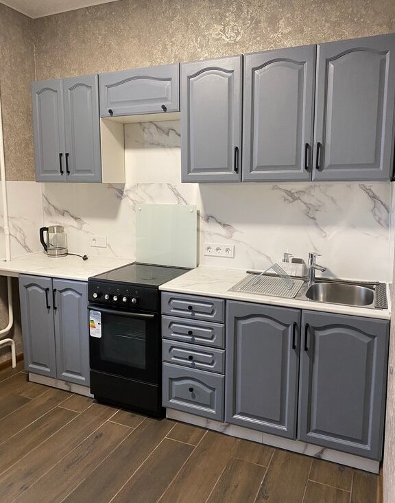 На кухне - холодильник, плита с духовым шкафом, чайник. Мебель - кухонные шкафы, стол и два стула. Есть дополнительная секция кухни (можно вынести на балкон).