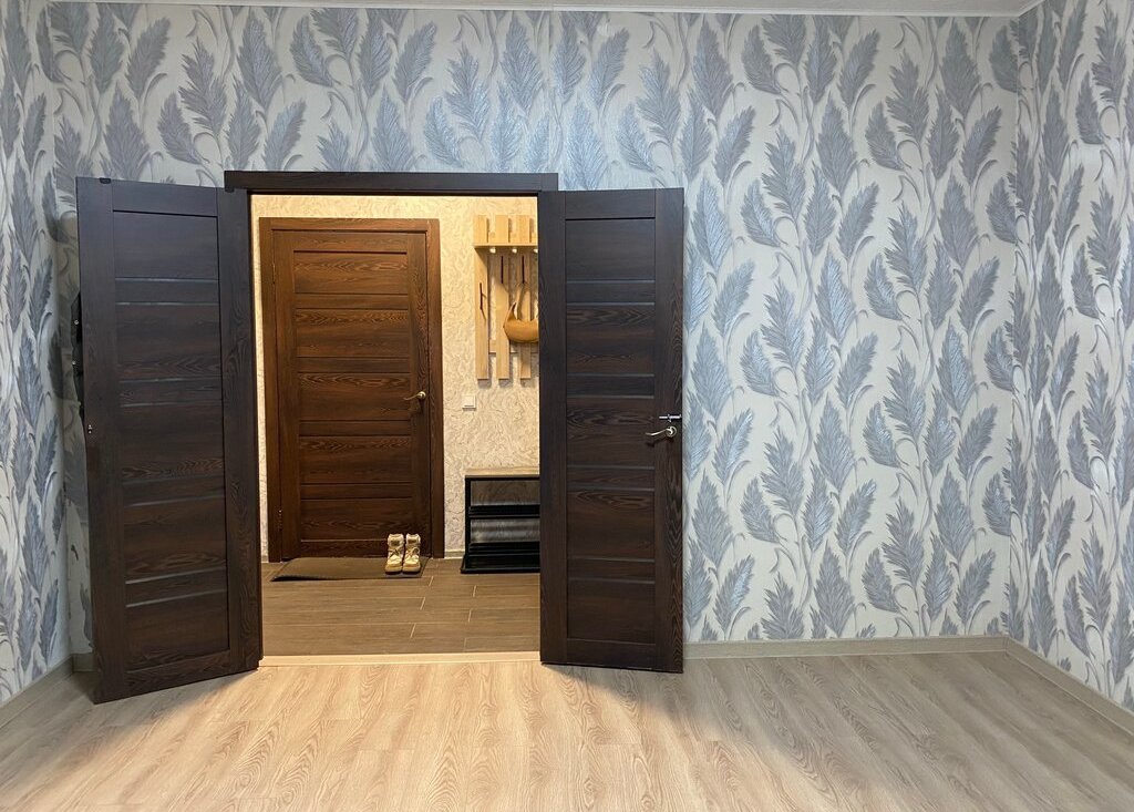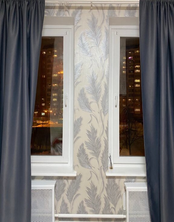 В комнате два окна, закрывает двойной карниз (тюль + шторы блэкаут). Лампа регулируется пультом по интенсивности освещения и на тёплый/холодный свет. Двери в комнату распашные, без проблем можно занести любую необходимую мебель.