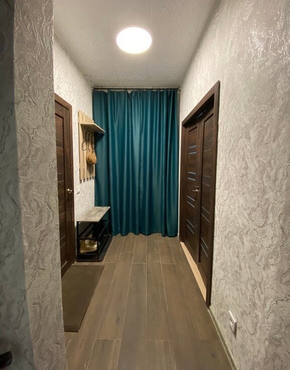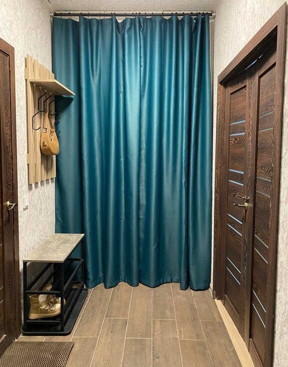 В качестве места для хранения в прихожей есть очень вместительный гардероб с 2-мя широкими стеллажами с полками и штанга для вешалок, закрывается портьерами. В прихожей есть обувница, настенная вешалка с полкой и зеркало.