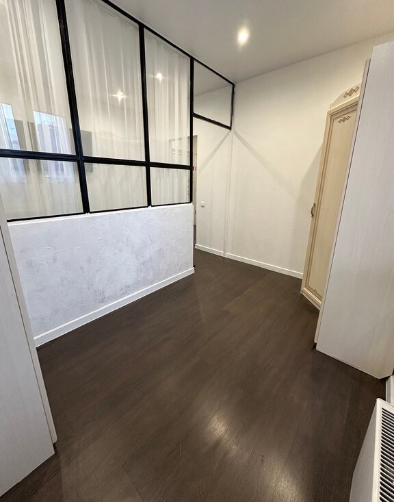 • Уникальное зонирование: стеклянная перегородка с чёрным профилем — спальня и гостиная, как в двухкомнатной квартире