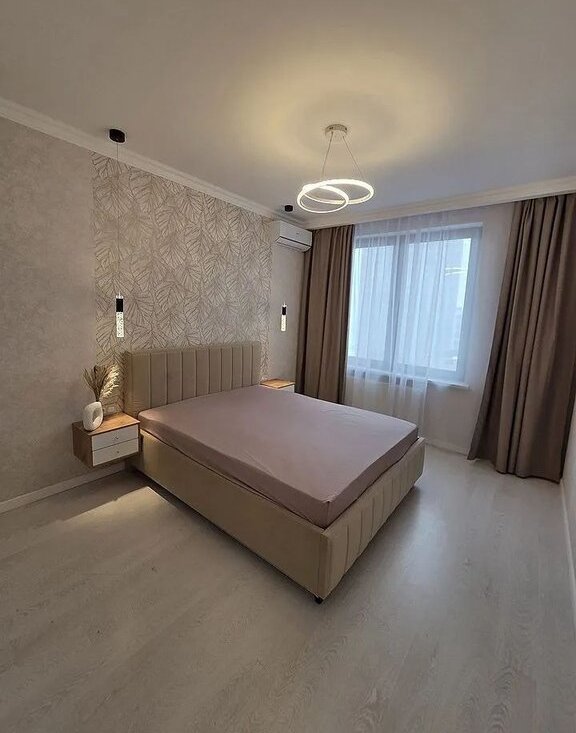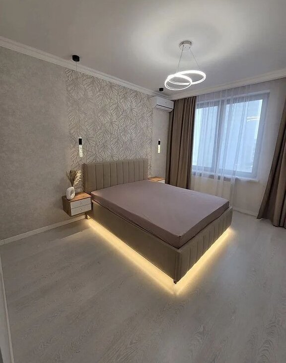 Благодаря разноплановой подсветке в теплой тональности в спальне можно создать любое настроение. Просторная двухспальная кровать и фирменный ортопедический матрас фирмы аskоnа сделают ваши сны поистине незабываемыми, а кондиционер поможет создать идеальную температуру воздуха для ещё большего комфорта.