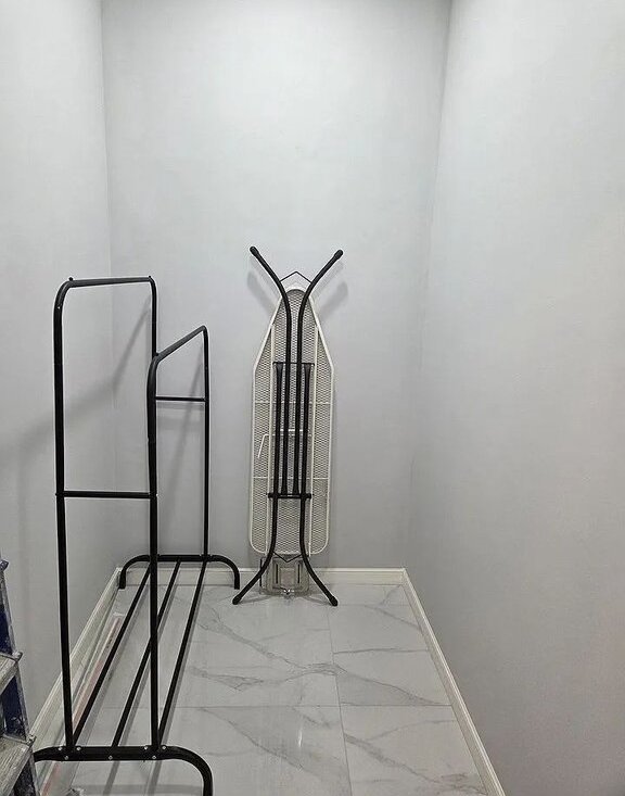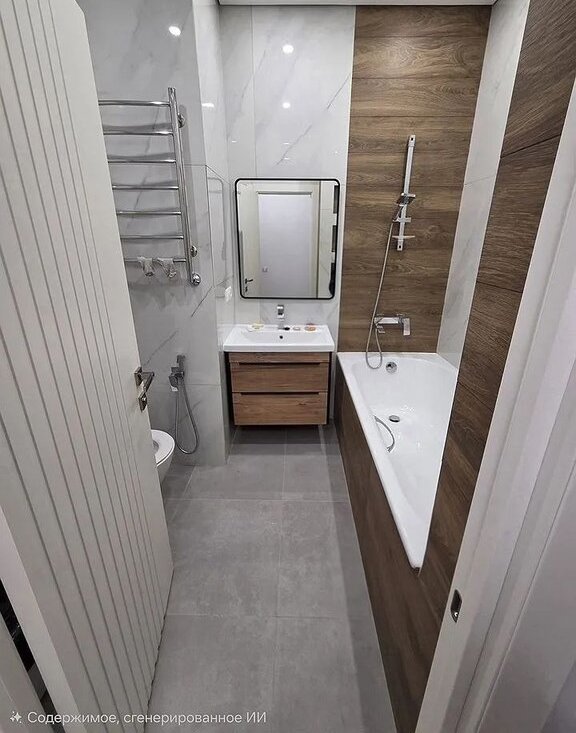 Ванная комната оснащена проточным водонагревателем на случай отключения холодной воды, гигиеническим душем, полотенцесушителем, стиральной машиной, зеркалом с сенсорной подсветкой и удобными встроенными полками, на которых можно разместить все необходимые средства.