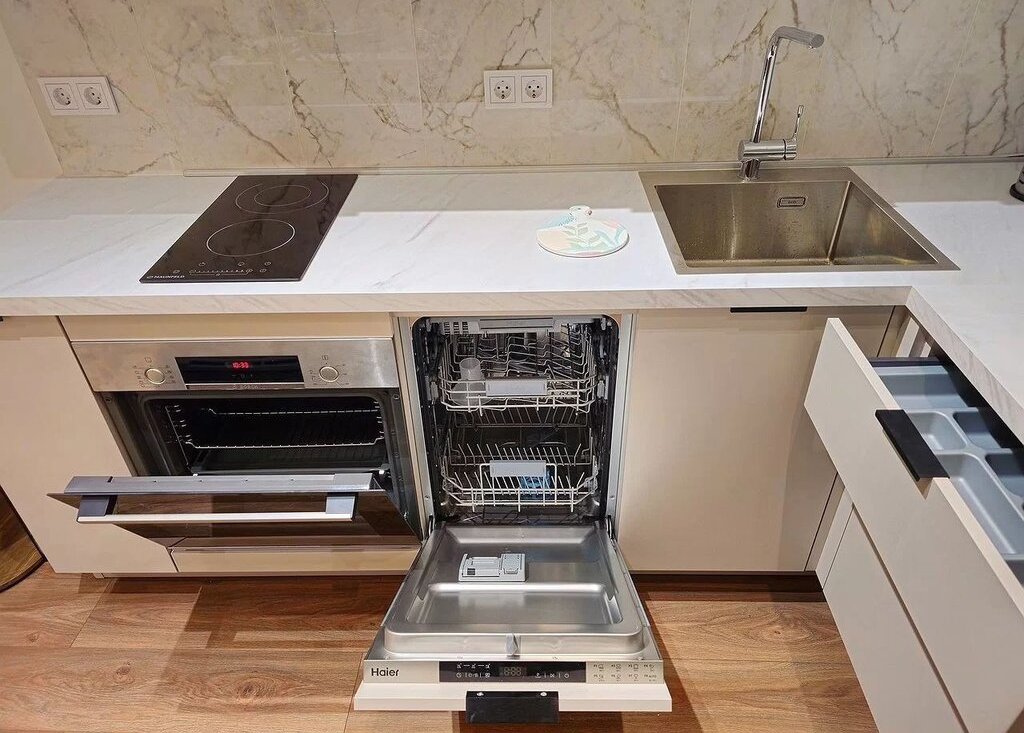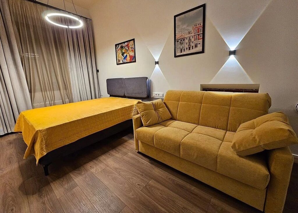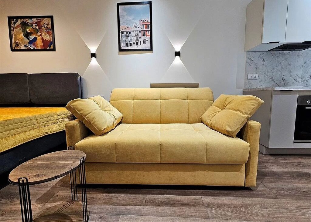 Имеется все необходимое для комфортного проживания: двуспальная кровать с ортопедическим матрасом, уютный диван, кухонный гарнитур, рабочее место, телевизор, кондиционер, интернет, домофон, стиральная машина, посудомоечная машина, холодильник Liеbhеrr, варочная панель, духовой шкаф Воsсh с вытяжкой, гладильные принадлежности, сантехника европейских производителей.