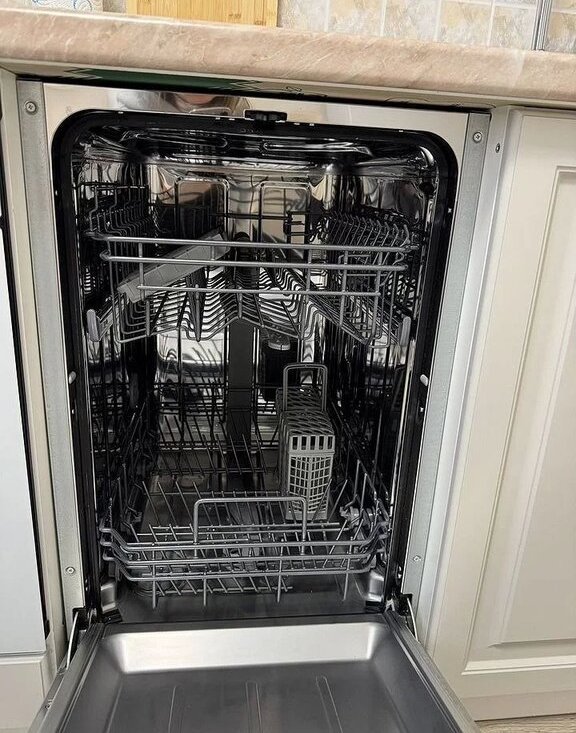 - Современная кухня с холодильником, стиральной машиной, плитой, духовкой, микроволновой печью, посудомоечной машиной, пылесосом и телевизором.