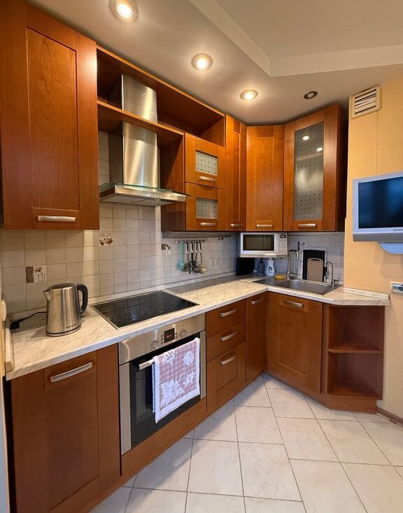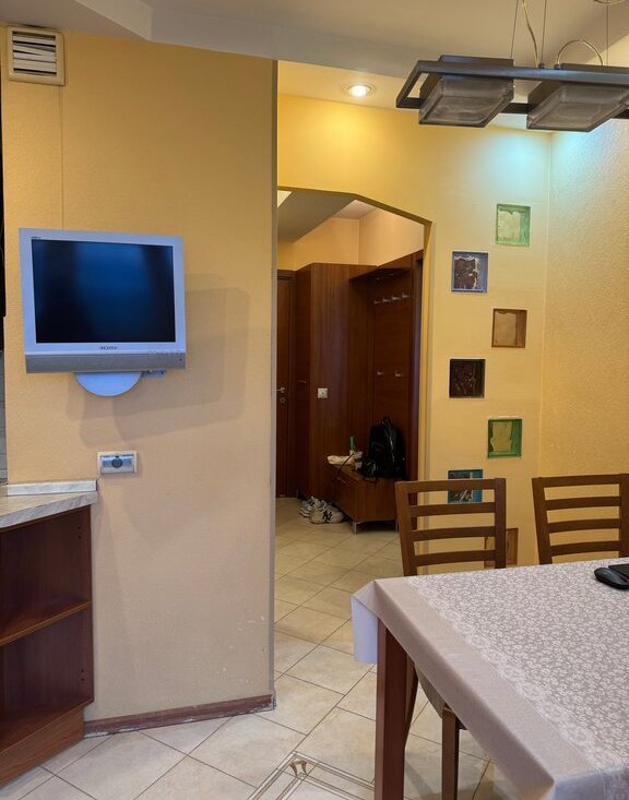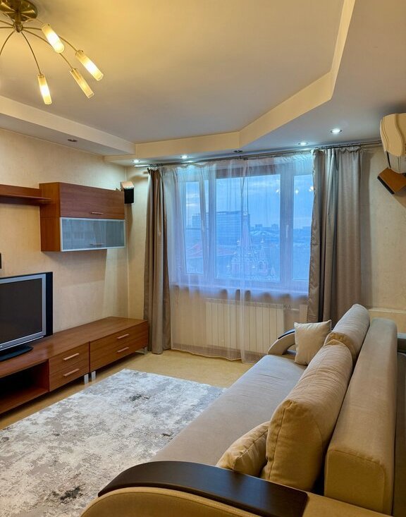 · Евроремонт, импортная современная мебель: удобный диван, встроенный шкаф-купе, кухонный гарнитур с единой столешницей.