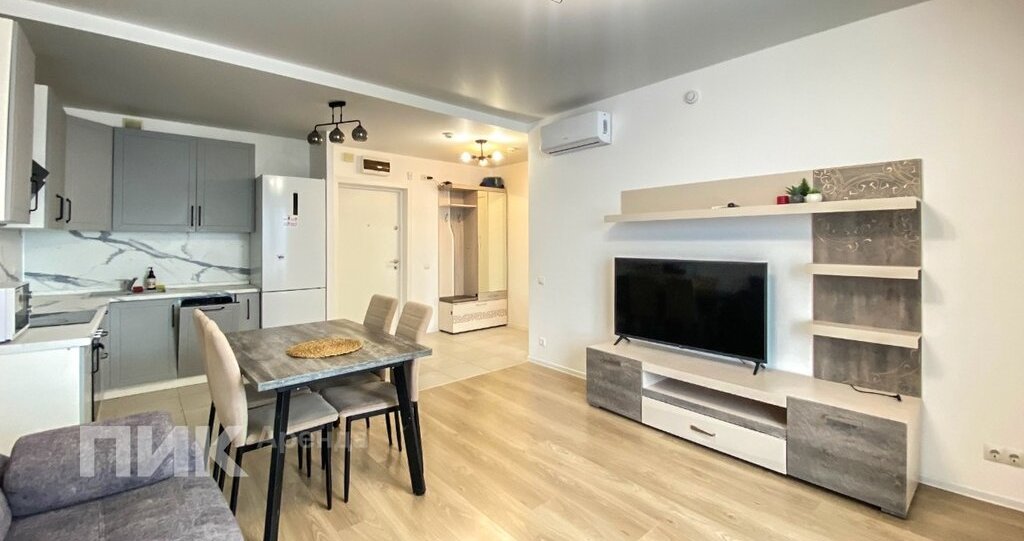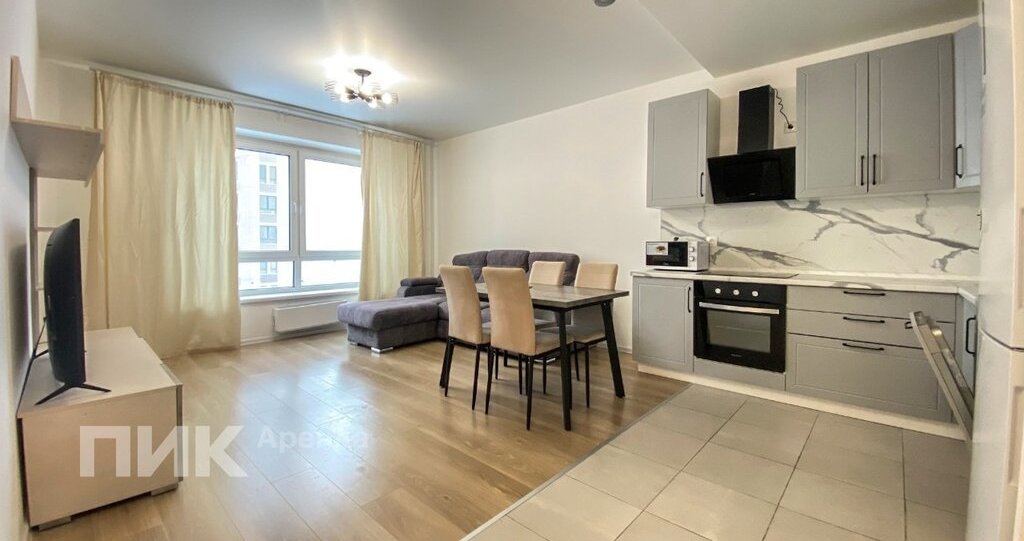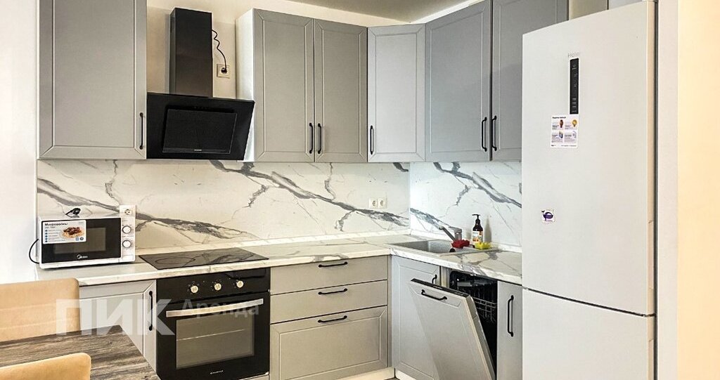 Квартира оборудована кухонным гарнитуром, мебелью и бытовой техникой: