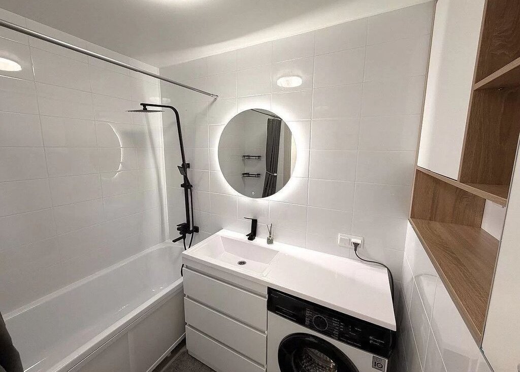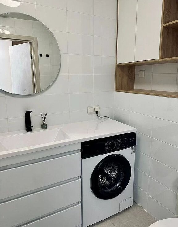 В ванной комнате установлена новая сантехника, душ, большая раковина с зеркалом, встроенный шкаф и вместительная тумба для всех девичьих) прелестей, стиральная машина.