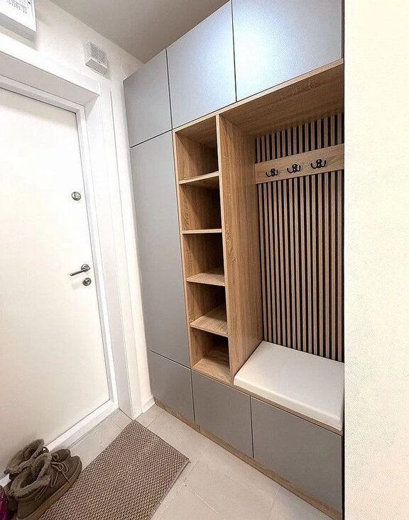 В коридоре полноценный шкаф для верхней одежды и обуви с удобными закрытыми и нет полками для мелочей.